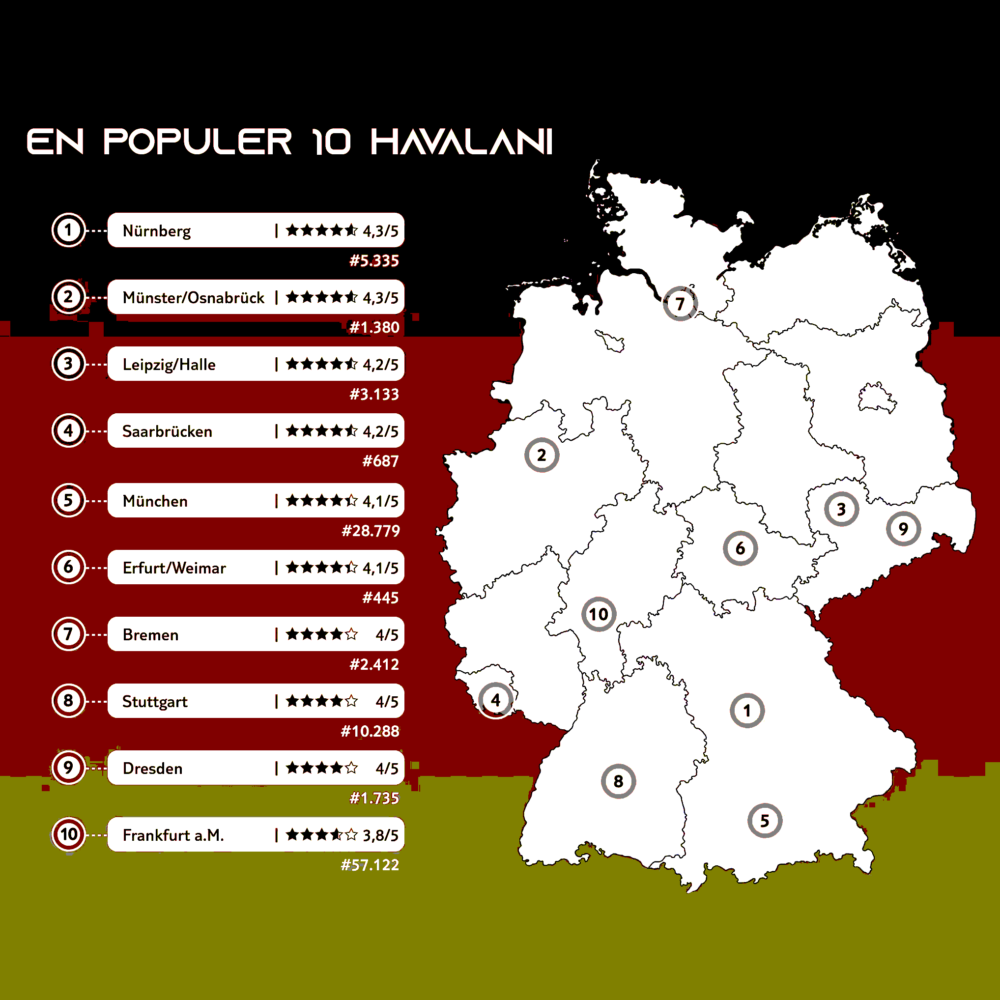 Almanya’nın köklü turizm acentası Tui AG’nin 2023 verilenine göre en popüler havaalanları sırasıyla şu şekildedir,